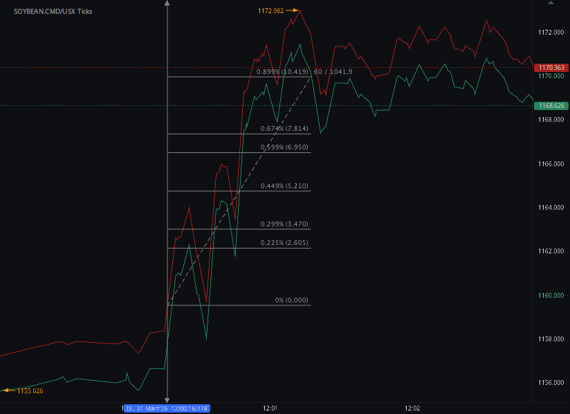 According to our analysis soybeans (ZS) futures prices moved around 40 ticks on USDA Grain Stocks and USDA Prospective Plantings data on 31 March 2026.