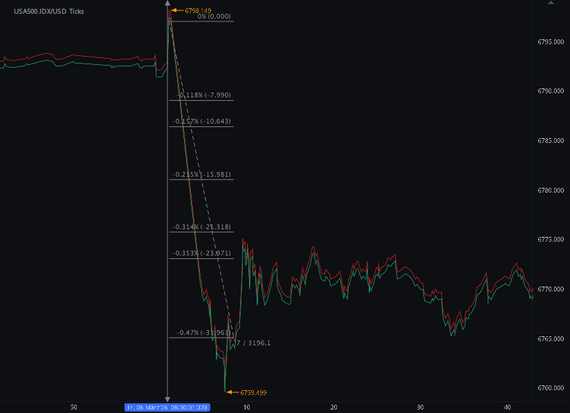 According to our analysis XAUUSD (spot gold) moved 16 points and US500 moved 31 points on US Employment Situation (Non-farm payrolls / NFP) data on 6 March 2026.